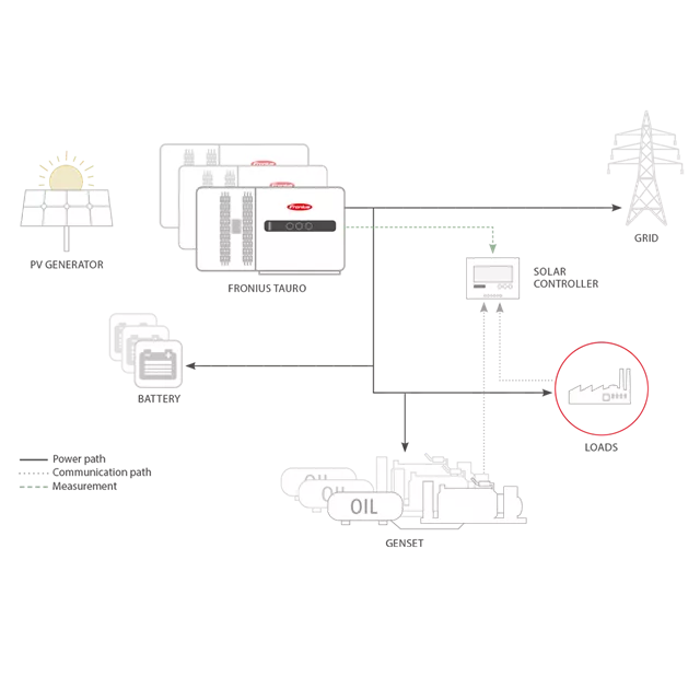 The Fronius PV-Genset solution ensures optimum interaction between the photovoltaics and diesel generator. This saves fuel, lowers energy costs and ensures a stable and reliable power supply.