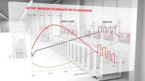 Fronius battery charging systems with the Ri charging process ensure ultra-gentle charging of the traction batteries, which reduces wear. Reaching the maximum service life of the battery is not unusual; and the battery even remains efficient for much longer. To counter capacity losses after several years of use, Fronius devices also have special charging characteristics. In many cases, these improve the efficiency of the battery, ensuring longer driving times and increased availability of the forklift trucks.