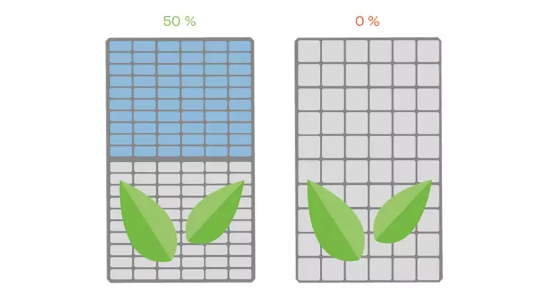 Skuggningsbeteendet förbättras också med halvcellsmoduler, där bypass-dioder delar modulerna på mitten. Om den nedre eller övre halvan av halvcellsmodulen skuggas av exempelvis löv, kan den andra modulhalvan ändå fortsätta att generera full utgångseffekt. I jämförelse skulle en fullcellsmodul med samma skuggning förlora hela modulens effekt.